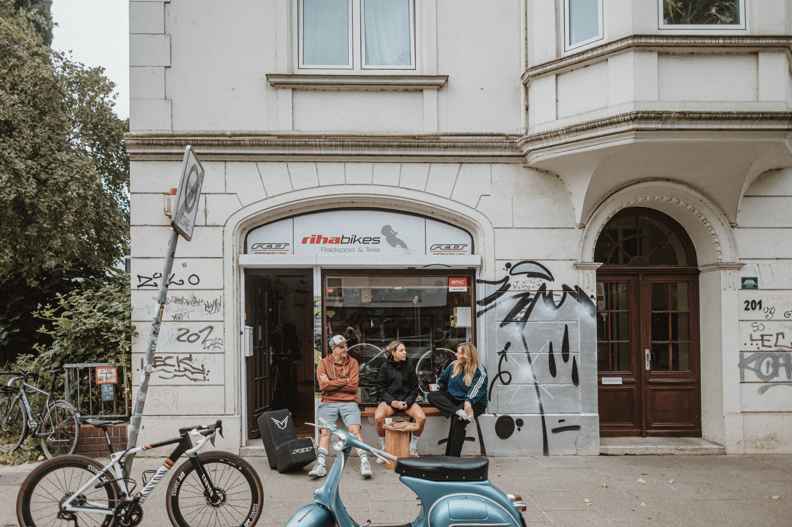 Wir treffen uns bei RihaBikes – Bremens Adresse für Radsport und Triathlon. Seit Jahren steht das Team um Vladi Riha und Carolin Schiff für Leidenschaft, Expertise und hochwertige Marken wie Specialized, BMC, Cervélo, Colnago und Felt – Beratung auf Profi-Niveau inklusive.
